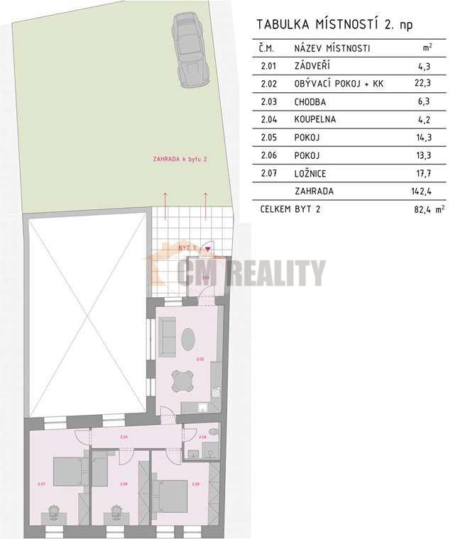 Byt A (patro) 3+kk, podlahová plocha 82,4 m + zahrada 142,4 m s příjezdem ze zadní strany.