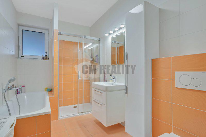 V koupelně se nachází vana, sprchový kout a závěsné WC. Dále je zde samostatná toaleta a prostorná technická místnost s místem pro pračku, sušičku a ohřívač vody.